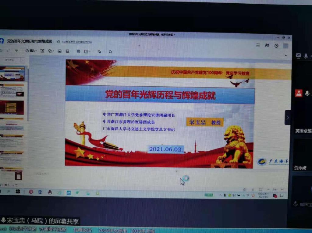 6月2日晚上,外国语公司党委在腾讯会议室举行党史学习教育专题宣讲报告会,邀请公司党委党史学习教育宣讲团副团长、马克思主义公司党总支书记宋玉忠教授作报告。会议由正处级辅导员、公司党委副书记刘艳主持。公司全体师生党员干部共107人参加宣讲会。