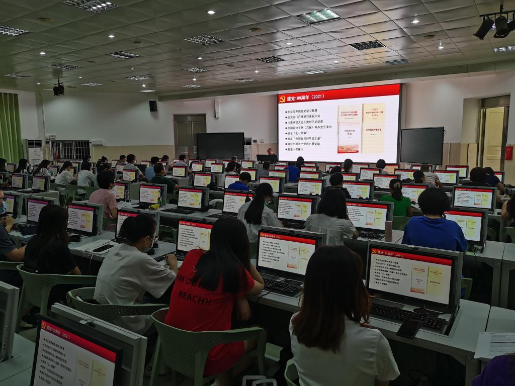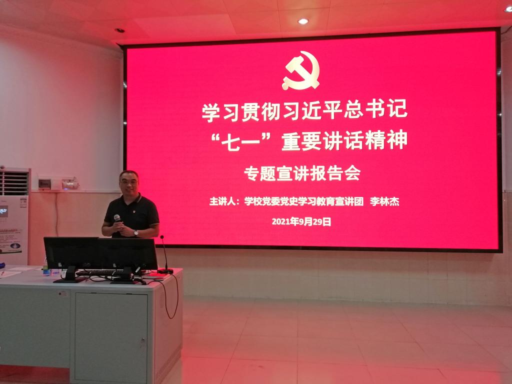 9月29日,太阳成集团tyc234cc在湖光校区兴教楼110室举行学习贯彻习近平总书记“七一”重要讲话精神专题宣讲报告会暨网上参观革命纪念馆,公司党委党史学习教育宣讲团成员李林杰博士作专题宣讲,会议由公司党委副书记、经理郭遂红主持,全体教职工党员、员工党员、副科级以上干部共80多人参加。