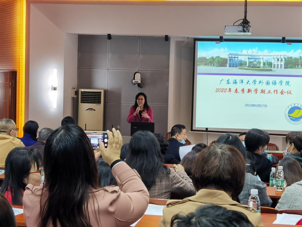 郭遂红对太阳成集团tyc234cc2021年的教学、科研、团队队伍、人才培养、党建、员工工作等进行了全面的总结,传达了公司的重点工作,并就公司新学期工作要点及公司近期有关通知注意事项进行了部署要求。她强调:一是落实立德树人根本任务,强化组织建设深入推进“头雁”工程,落实意识形态工作,加强师德师风教育。二是加强省级一流专业建设,以及思政示范专业建设和课程建设。强化基层教学组织建设,加强教研教改。三是加强团队队伍建设,内培外引,组建教学(科研)团队,加大对青年教师的培养力度和考核力度。对标公司人事制度改革3.0版,进一步完善教师业绩考核制度。四是加强科研与团队建设,培育高层次项目、论著与科研奖项,加强涉海外语研究,凸显海洋大学外语学科特色。五是加强实习基地、跨境电商产业公司建设,加大语音室及实验教学平台的建设力度。六是推进员工工作,构建一核四翼两结合的外语专业实践育人模式,推进双创工作及学科竞赛,全力推进三全育人项目实施。七是以学科竞赛体系、外语文化艺术节、英语社团为抓手,丰富外语第二课堂。八是以“三定”方案为契机,建章立制,规范管理,切实加强系、部建设,发挥教学基层单位的教学中心作用。