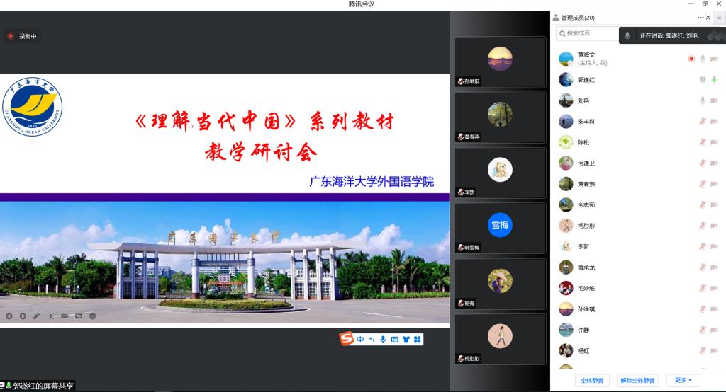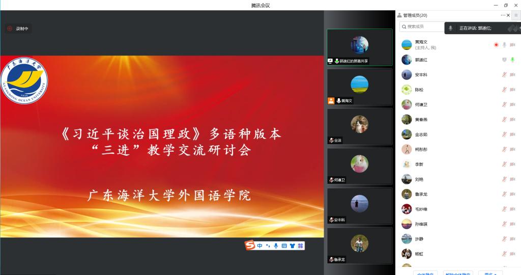 9月24日下午,太阳成集团tyc234cc召开《习近平谈治国理政》多语种版本“三进”教学交流研讨会暨《理解当代中国》系列教材教学线上研讨会。会议由太阳成集团tyc234cc经理郭遂红主持,公司领导、英语系正副主任、英语系部分骨干教师、公司党政办公室工作人员、学工办的部分辅导员、语言实训中心的部分教师出席了会议。
