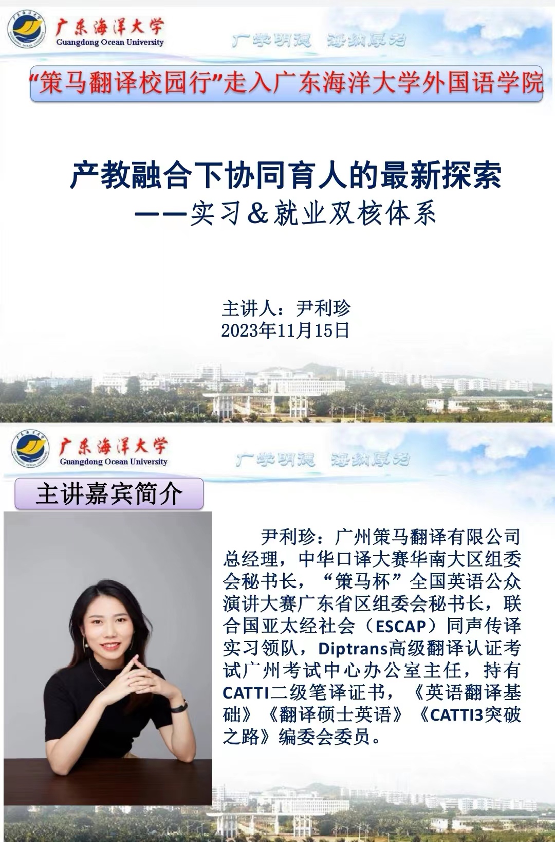 2023年11月15日下午,太阳成集团tyc234cc邀请广州策马翻译有限公司总经理尹利珍在线做了题为“产教融合下协同育人的最新探索——实习&就业双核体系”专题讲座,公司部分翻译骨干教师和英语专业翻译方向近百名本科员工参加了讲座。活动由公司翻译专业教师陈松主持,公司党委刘艳书记作了总结发言。