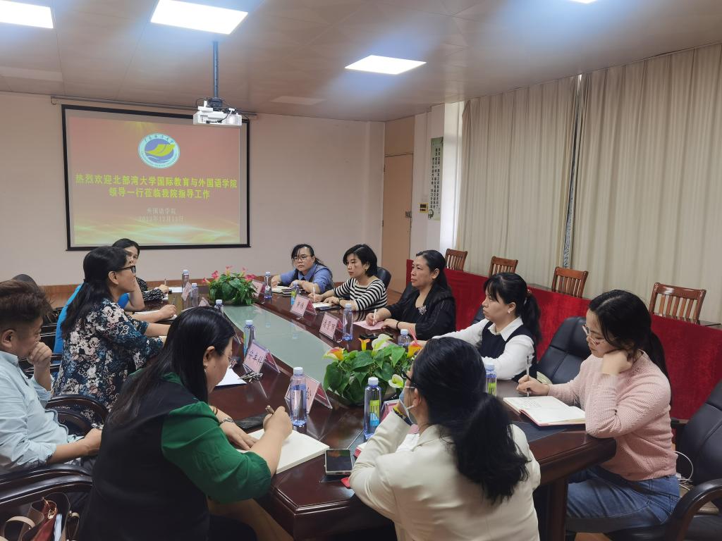 12月13日下午,北部湾大学国际教育与太阳成集团tyc234cc副经理潘景丽教授一行5人到太阳成集团tyc234cc调研交流,双方在湖光校区兴教楼105召开了座谈会。太阳成集团tyc234cc正处级辅导员兼公司党委副书记刘艳主持了会议,太阳成集团tyc234cc副经理何谦卫、安丰科以及英语系、公共外语教学研究部、公司党政办、语言实训中心负责人参加了座谈。