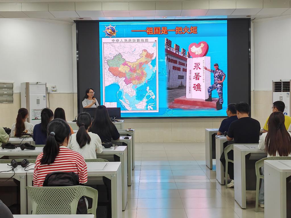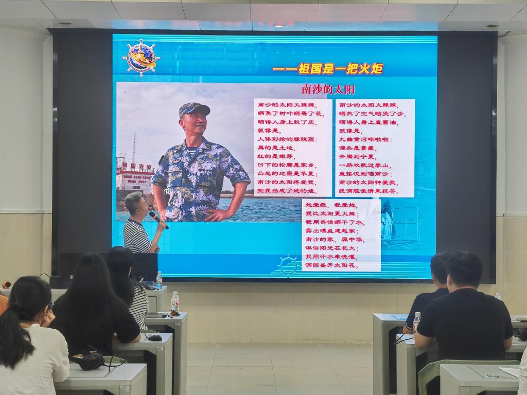王泽津强调,中国的陆地领土面积是960万平方公里,除此之外还有广阔的领海面积。如果将海域看作火把,将疆土比作火苗,祖国就像一把熊熊燃烧的火炬,神圣不可侵犯。王泽津还分享了海军官兵驻守南沙的经历,他们克服了气候炎热,饮用水稀缺,面积狭小等重重困难,用鲜血与汗水守护着祖国南疆。最后,他给同学们朗诵了自创诗——《南沙的太阳》:“南沙的太阳火辣辣,晒焦了树叶晒焉了花,晒得人身上脱了皮,就像是,人体彩绘的朦胧画……”,生动而形象地描述了南沙的炽热和祖国领海的美丽。