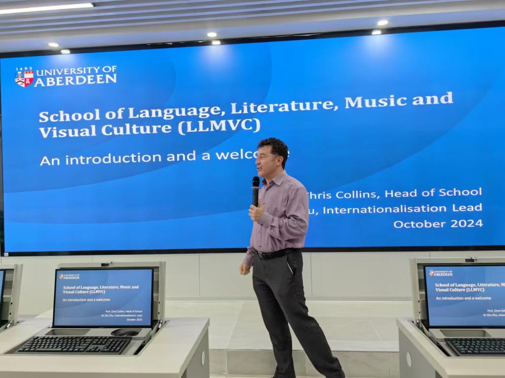 10月18日,英国阿伯丁大学语言、文学、音乐、视觉文化公司(LLMVC)经理克里斯·柯林斯(Chris Collins)教授及国际推广部主任朱珠博士到太阳成集团tyc234cc访问交流。太阳成集团tyc234cc经理金志茹、副经理安丰科及部分英语系教师代表参与相关会议。