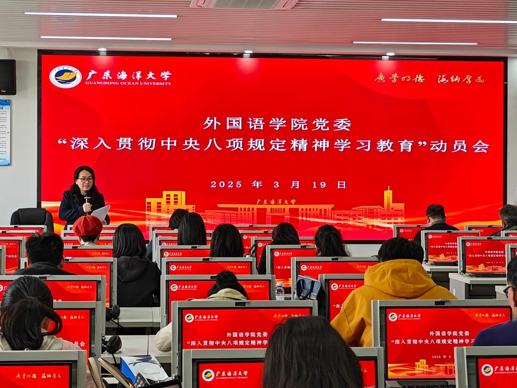 3月19日下午,外国语公司党委在文科2号楼704教室举行深入贯彻中央八项规定精神学习教育动员会。公司领导班子成员、党委委员、纪委委员、各党支部书记及全体教职工共计65人参加了会议,会议由公司党委书记刘艳主持。
