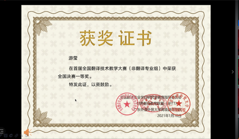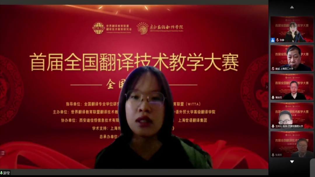 1月10日,首届全国翻译技术教学大赛决赛落下帷幕,公司太阳成集团tyc234cc教师游莹荣获全国总决赛一等奖。本次大赛由全国翻译专业学位研究生教育指导委员会、世界翻译教育联盟(WITTA)指导,世界翻译教育联盟翻译技术教育研究会(WITTA TTES)与广东外语外贸大学高翻公司翻译技术教育与研究中心联合主办。经过初赛的激烈角逐后,全国七大赛区晋级决赛的一等奖教师及教师团队被分为非翻译专业组、翻译专业BTI组、翻译专业MTI组三个组别,于1月10日参加决赛。本次比赛根据选手赛前提交的授课视频、课程大纲和选手说课答辩三部分综合得分,依总分高低决定选手最终名次。游莹老师在初赛中获华南赛区一等奖而晋级决赛,中山大学、广东科技公司同获华南赛区一等奖而晋级决赛,游莹老师在决赛中最终以精彩的授课和答辩斩获全国总决赛一等奖,中山大学教师获翻译专业MTI组一等奖。