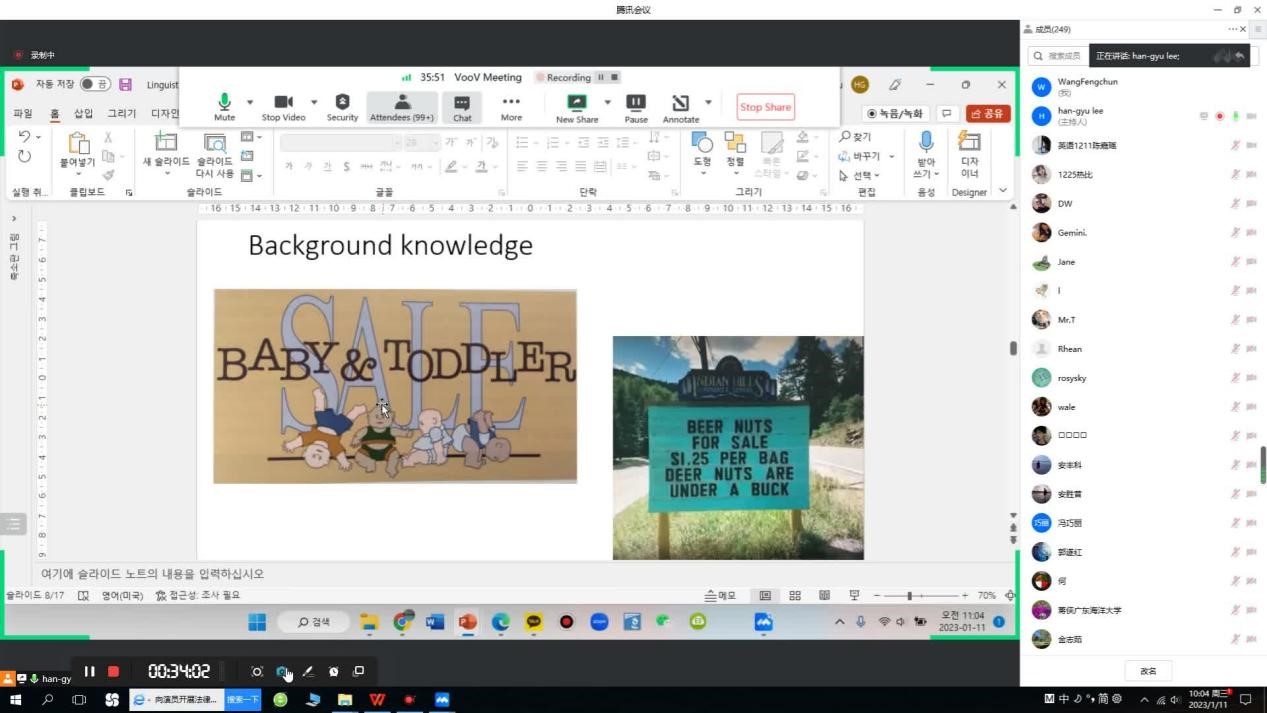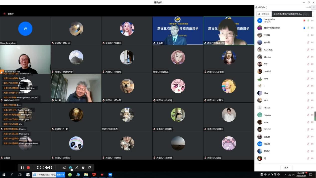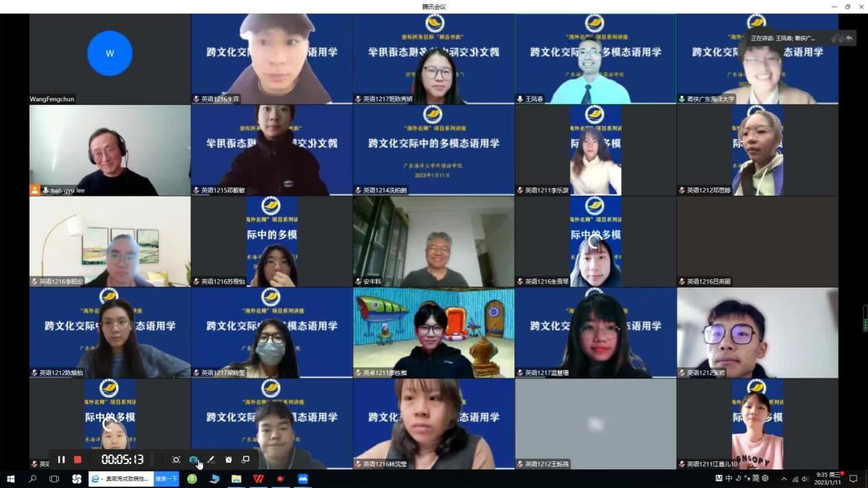 2023年1月11日上午,韩国庆熙大学教授李瀚揆(Han-Gyu Lee)应邀为公司太阳成集团tyc234cc师生做了题为“语言学与语用学”的线上讲座,开启了海外名师项目“跨文化交际中的多模态语用学”系列研讨活动的序幕。太阳成集团tyc234cc经理郭遂红、副经理安丰科等师生代表240余人参加本次线上讲座,讲座由太阳成集团tyc234cc副教授蒋侠博士主持。