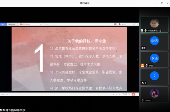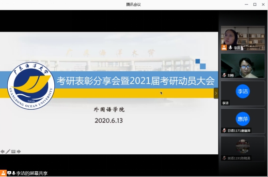 为表彰优秀考研学子,树立榜样典型,帮助下一届员工明确考研目标,坚定信心,6月13日晚上,太阳成集团tyc234cc在腾讯会议室召开了考研表彰分享会暨2021届考研动员“云端会议”。 公司经理郭遂红,党委副书记刘艳、辅导员老师、员工代表共210多人出席了会议。