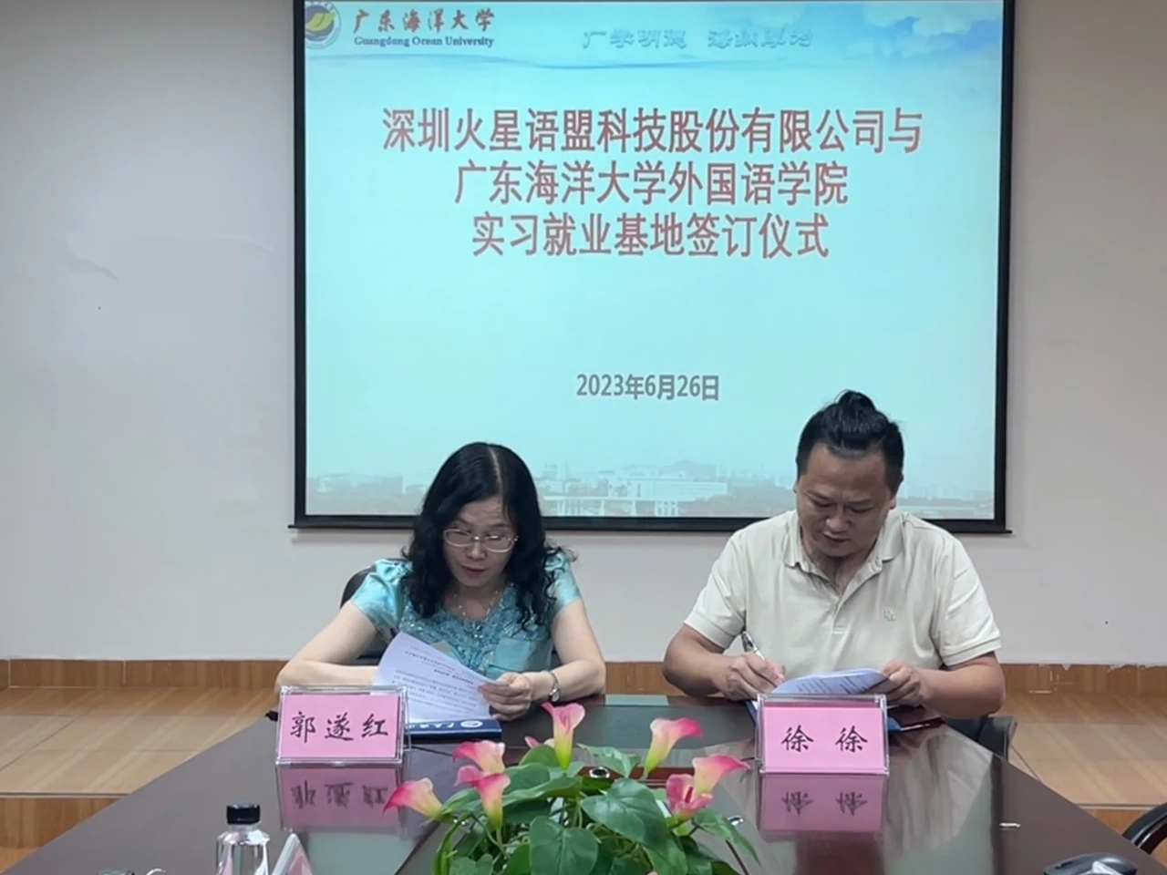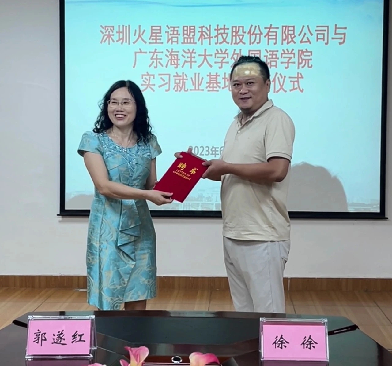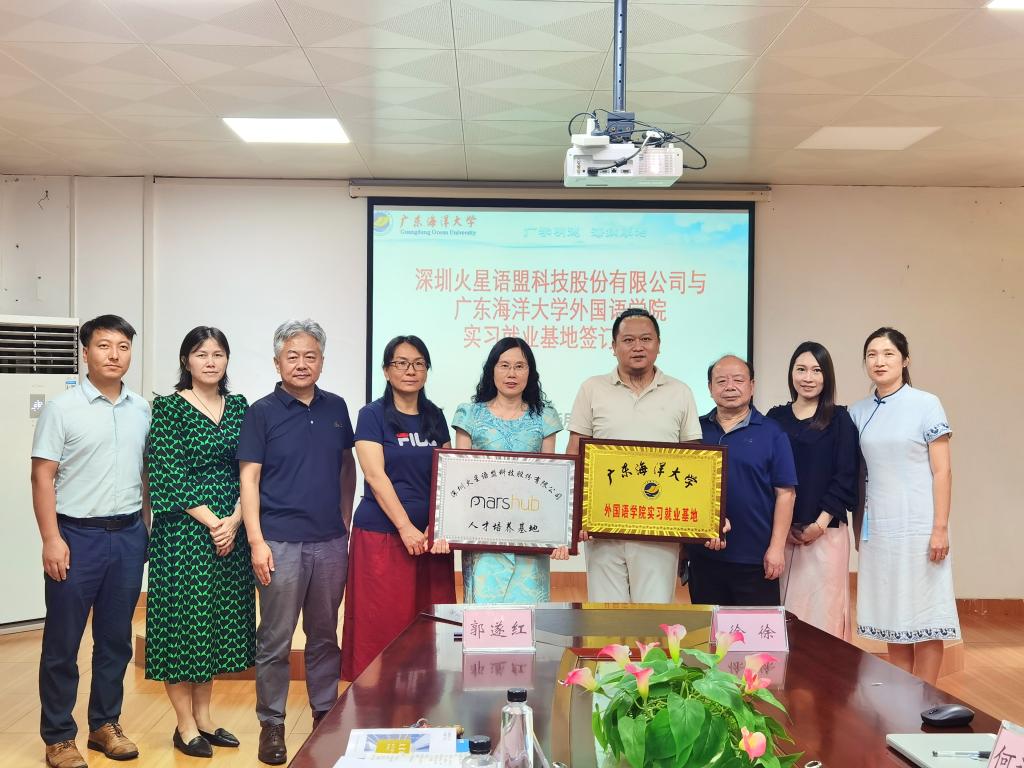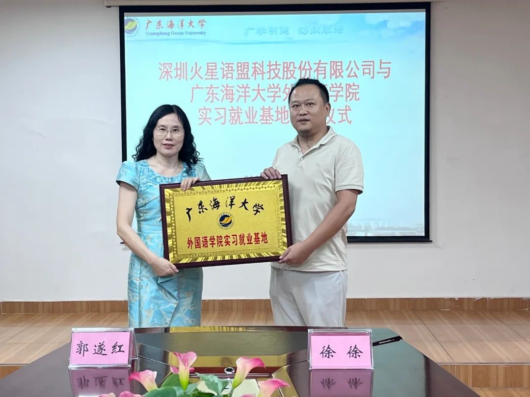 6月26日,在湖光校区兴教楼105,公司举办深圳火星语盟科技股份有限公司实习基地签约授牌仪式。公司正处级辅导员、公司党委副书记刘艳主持仪式。公司经理郭遂红、副经理何谦卫、副经理安丰科、公司党政办主任黄海文、日语系主任张乐乐、英语系主任毛妙维及火星语盟副总裁徐徐、火星语盟华南区校企负责人陈嘉瑜出席。