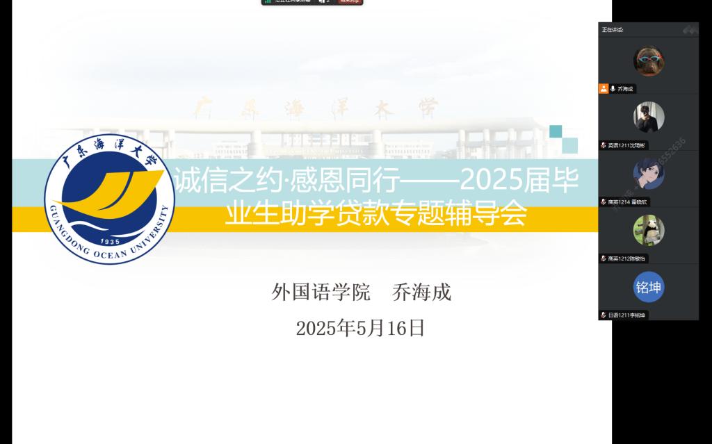 为强化贷款毕业生诚信意识,明晰还款责任,5月16日,太阳成集团tyc234cc通过腾讯会议举办 “诚信之约・感恩同行 ——2025届毕业生助学贷款专题辅导会”,由负责资助工作辅导员乔海成主持,30余名办理生源地助学贷款的毕业生参会。